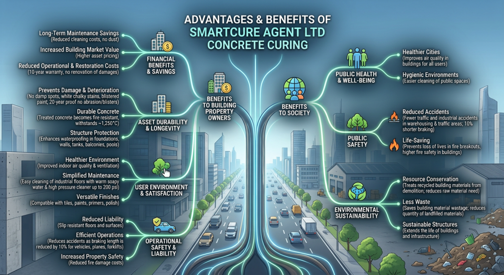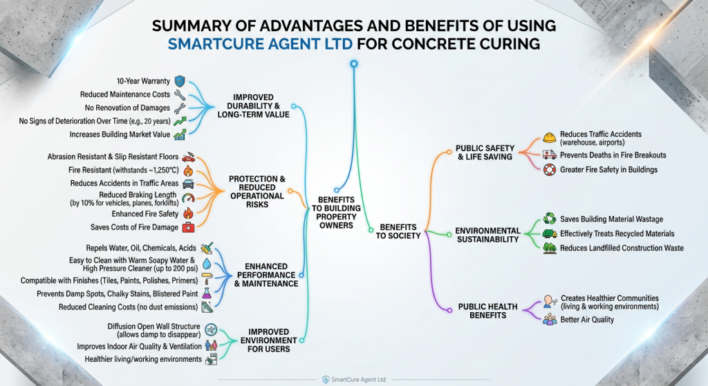 Advantages and benefits to building property owners and society for using SmartCure Agent Ltd to cure concrete: